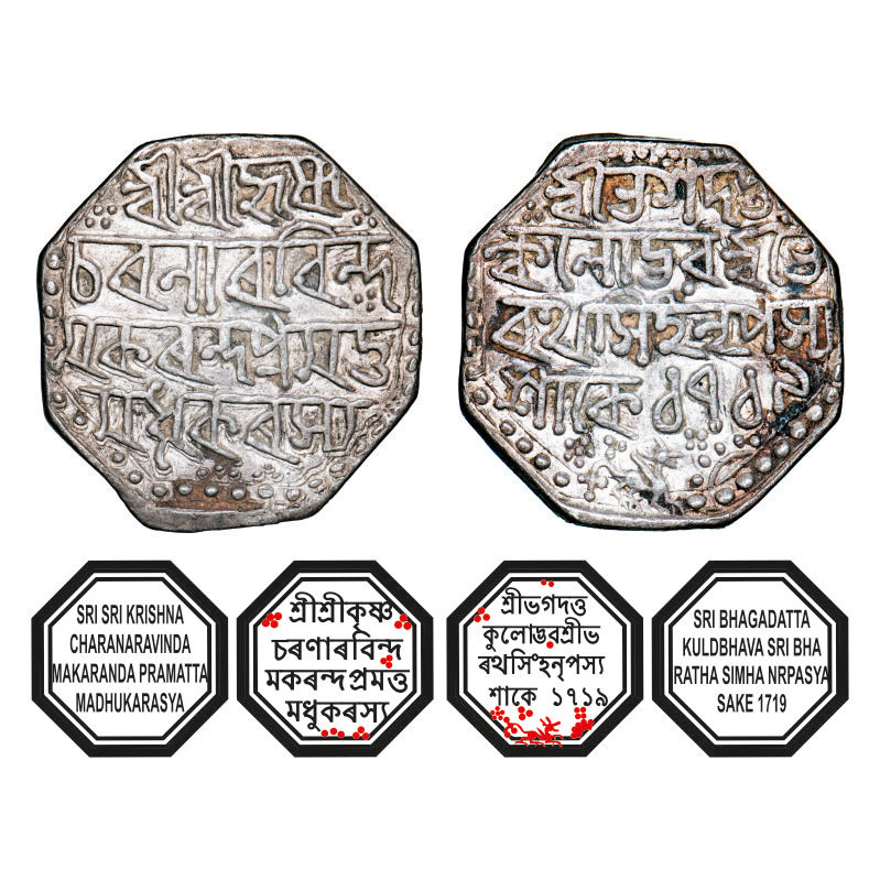 | Assam, Octagonal Silver Rupee, 11.21g, Bharatha Simha (Moamaria Rebels) (1791-1797), Sk. 1719, Assamese legends in four lines, with invocation to Krishna, Obv: Sri Sri Krishna/ (reversed 'Cha') Charanaravinda/ Makaranda Pramatta/ Madhukarasya, Rev: Sri Bhagadatta/ Kulodbhava Sri Bha/ratha Simha Nrpasya/ Sake 1719, lion running right, below. Reverse die perfectly struck at 6 o'clock. (A.Mitra. Rebel 13, RB. W 10.1). Toned Very Fine+, Very Rare. |