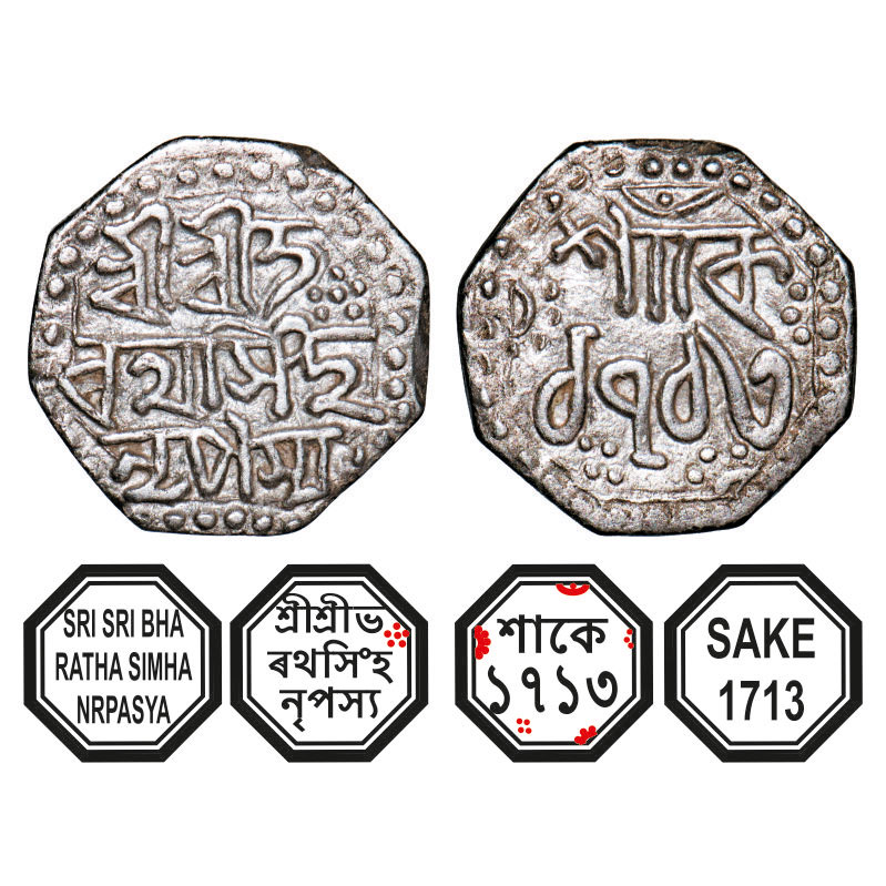 | Assam, Octagonal Silver Quarter Rupee, 2.71g, Bharatha Simha (Moamaria Rebels) (1791-1797), Sk. 1713, Assamese legends in three lines, Obv: Sri Sri Bha/ratha Simha/ Nrpasya , Rev: in two lines, Sake 1713, crescent on top. Struck by gold die. Reverse die perfectly struck at 6 o'clock. Ex Nicholas Rhodes collection. (A.Mitra. Rebel 16, RB. W 13.2 type). Extremely Fine, Very Rare. |