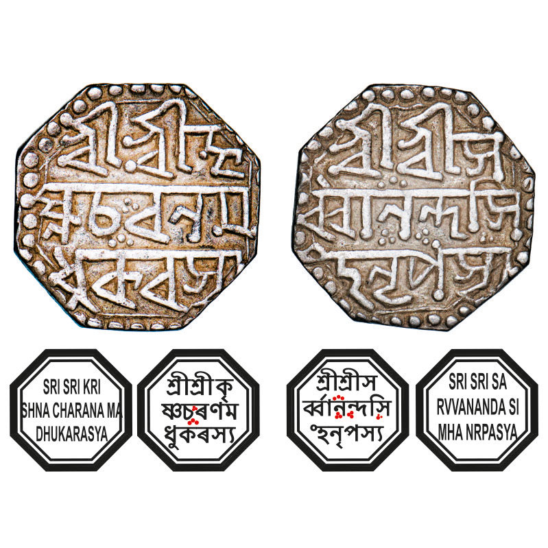 | Assam, Octagonal Silver Half Rupee, 4.52g, Sarvvananda Simha (Moamaria Rebels) (1793-1795), undated, Assamese legends in three lines, with invocation to Krishna, Obv: Sri Sri Kri/shna Charana Ma/dhukarasya, Rev: Sri Sri Sa/rvvananda Si/mha Nrpasya. Reverse die perfectly struck at 6 o'clock. (A.Mitra. Rebel 33A, RB. X 10 unlisted type). Toned Extremely Fine+, Very Rare. |