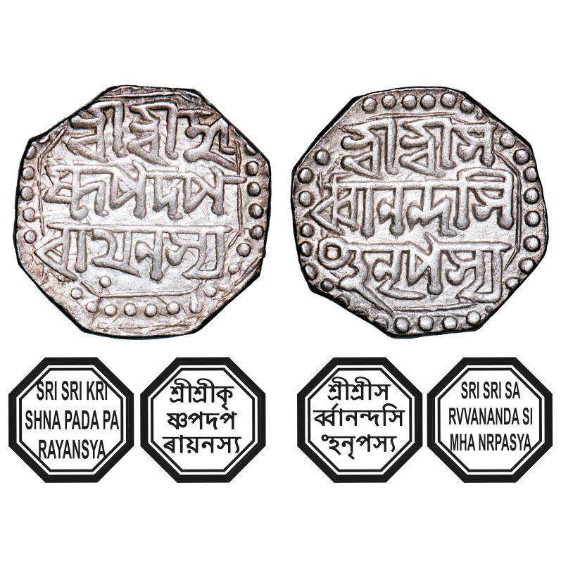 | Assam, Octagonal Silver Half Rupee, 5.56g, Sarvvananda Simha (Moamaria Rebels) (1793-1795), undated, Assamese legends in three lines, with invocation to Krishna, Obv: Sri Sri Kri/shna Pada Pa/rayansya, Rev: Sri Sri Sa/rvvananda Si/mha Nrpasya. Reverse die perfectly struck at 6 o'clock. (A.Mitra. Rebel 34, RB. X 11.1). Almost Mint State, Very Rare. |