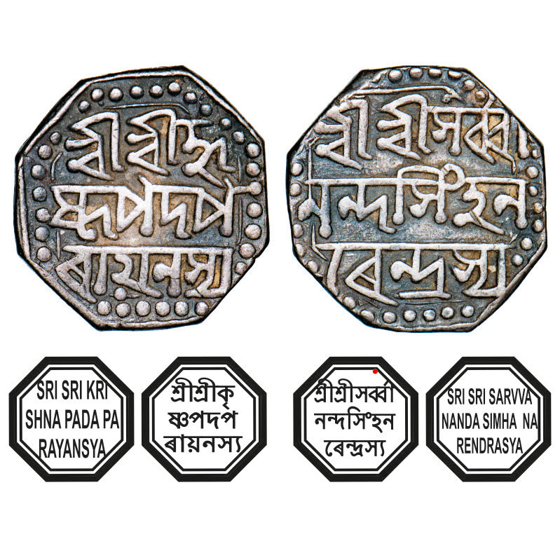 | Assam, Octagonal Silver Half Rupee, 5.67g, Sarvvananda Simha (Moamaria Rebels) (1793-1795), undated, Assamese legends in three lines, with invocation to Krishna, Obv: Sri Sri Kri/shna Pada Pa/rayansya, Rev: Sri Sri Sarvva/nanda Simha Na/rendrasya. Reverse die perfectly struck at 6 o'clock. (A.Mitra. Rebel 35, RB. X 12.1). Toned Very Fine+, Very Rare. |