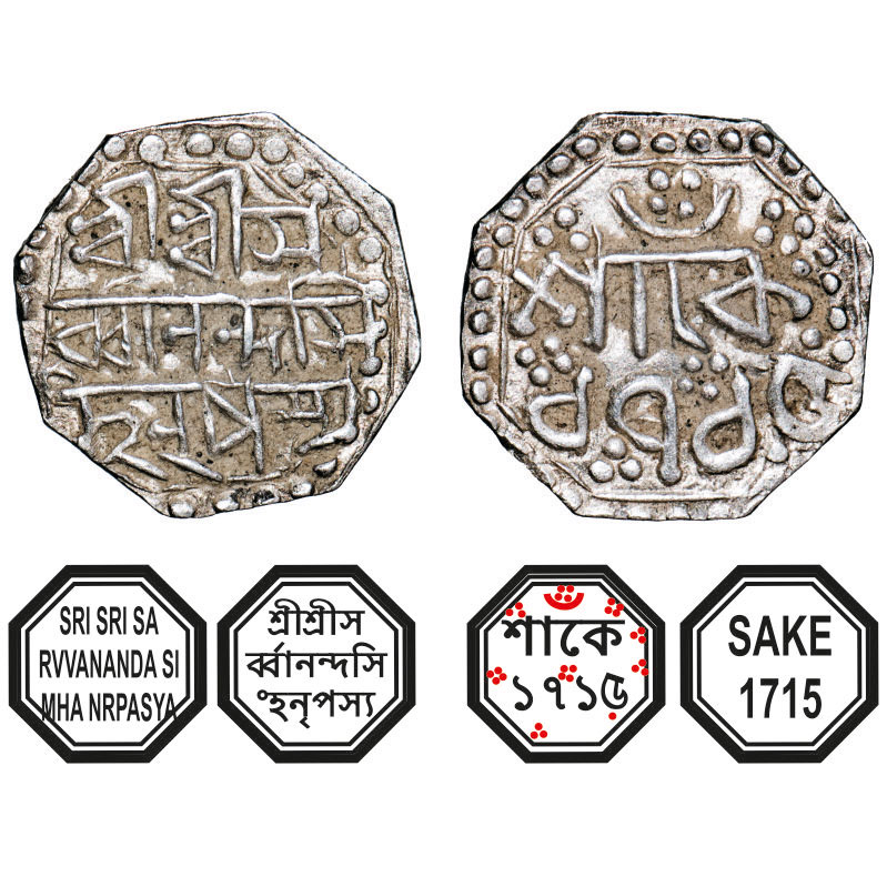 | Assam, Octagonal Silver Quarter Rupee, 2.69g, Sarvvananda Simha (Moamaria Rebels) (1793-1795), Sk. 1715, Assamese legends in three lines, Obv: Sri Sri Sa/rvvananda Si/mha Nrpasya, Rev: in two lines, Sake 1715, with big crescent on top. Reverse die perfectly struck at 6 o'clock. Ex Nichloas Rhodes collection (Ex Bennett) collection with pedigree tag.. (A.Mitra. Rebel 36, RB. W 13.1). Extremely Fine+, Very Rare. |