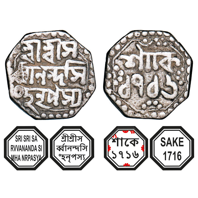| Assam, Octagonal Silver Quarter Rupee, 2.56g, Sarvvananda Simha (Moamaria Rebels) (1793-1795), Sk. 1716, Assamese legends in three lines, Obv: Sri Sri Sa/rvvananda Si/mha Nrpasya, Rev: in two lines, Sake 1716, with small crescent on top. Reverse die perfectly struck at 6 o'clock. (A.Mitra. Rebel 37, RB. W 14.1). About Very Fine, Very Rare. |