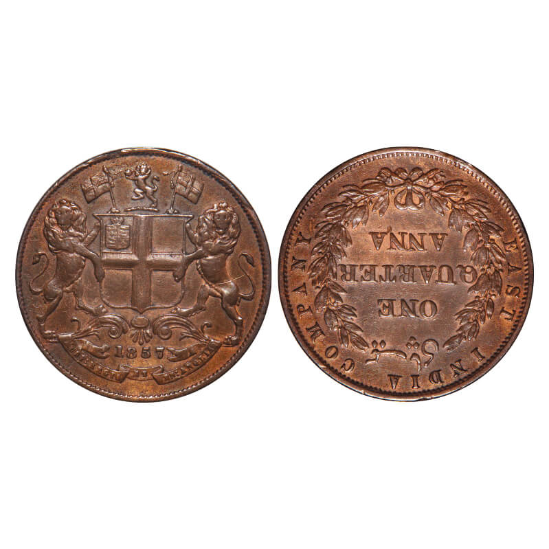 Victoria Queen, Copper, Quarter Anna, 1857, R. Heaton & Sons., Birmingham Mint, Two leaves, Rev inverted. F. Prid 152. GK 230. Extremely Fine. Rare.