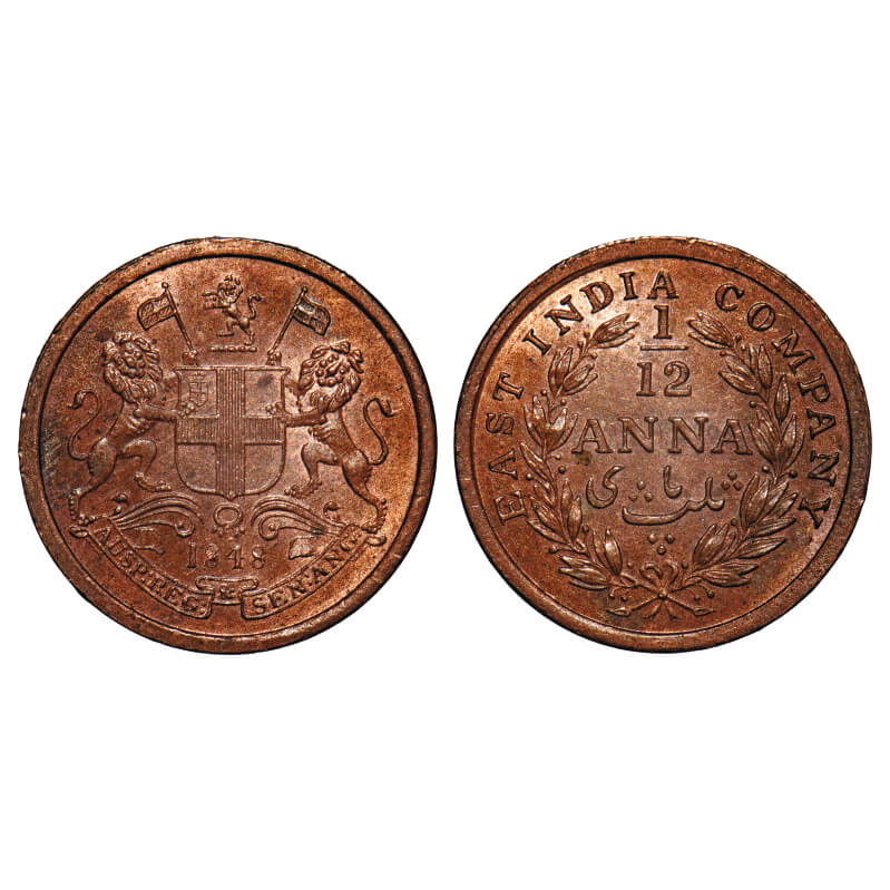Victoria Queen, Copper, 1/12 Anna, 1848, Calcutta Mint, Rev I, Wreath with 23 Berries (13L + 10R), Rev aligned. F. Prid 163. GK 237. Uncirculated. Rare.