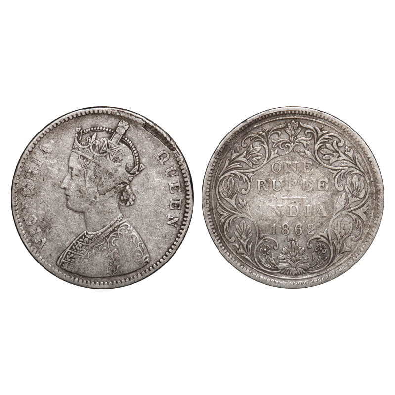 Victoria Queen, Silver, Rupee, 1862, Bombay Mint, A/II/2/4, Re used of earlier Rev dies w/o erasing top 2 dots, w/o initial J, Planchate flaw on Obv. F. Prid 84. GK 312. Very Fine. Rare. |
