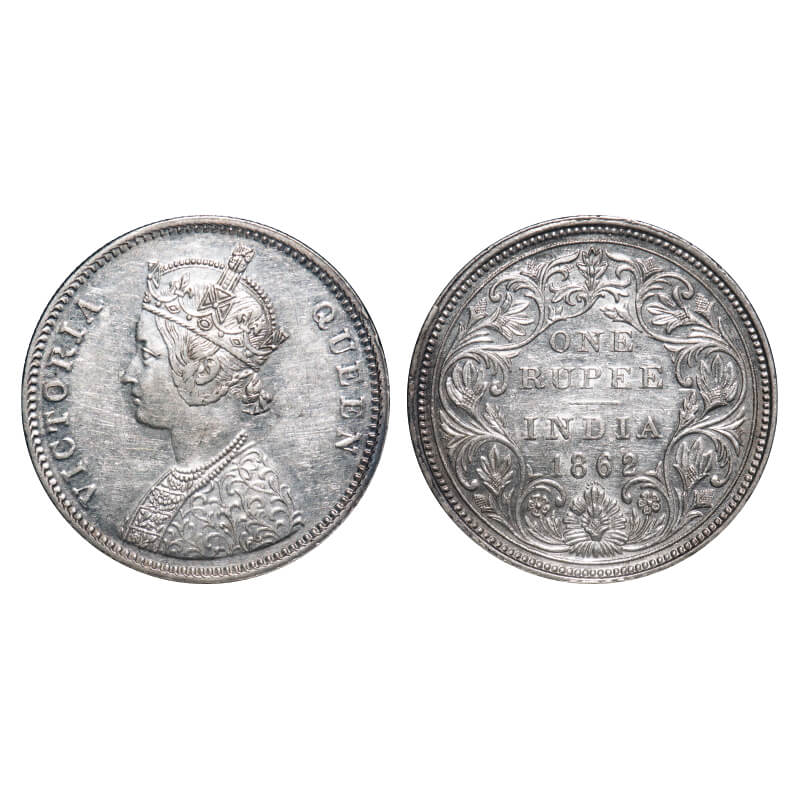 Victoria Queen, Silver, Rupee, 1862, Bombay Mint, A/II/0/7, w/o initial 'J', Broken letter 'R' of Victoria. F. Prid 87. GK 329. Almost Uncirculated, with luster. Rare. |