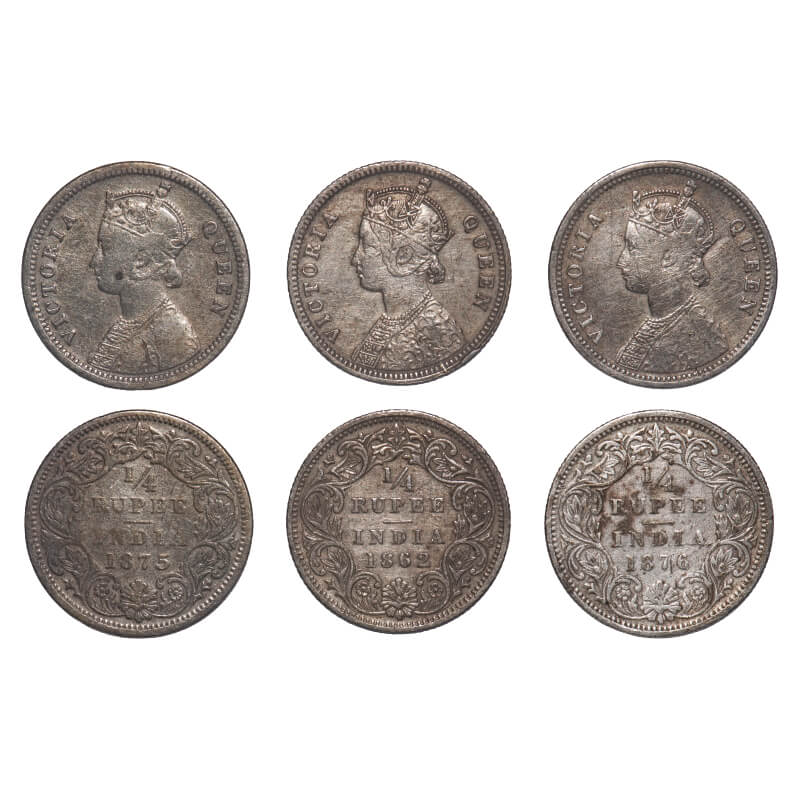Victoria Queen, Silver, 1/4 Rupee, (3 coins), 1) 1862, Calcutta Mint, A/I, 2) 1875, Bombay Mint, A/I, No dot, 3) 1876, Bombay Mint, A/I, No dot. F. Prid 376, 406, 407. GK 375, 666, 668. Very Fine to Extremely Fine+. Scarce. |