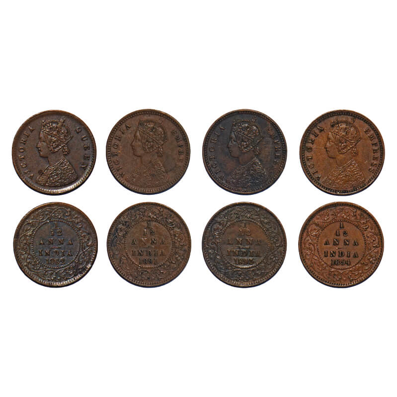Victoria Queen & Empress, Copper, 1/12 Anna, (4 coins), 1) 1862, Calcutta Mint, A/I, 2) 1891, Calcutta Mint, Obv B, No mint mark, 3) 1893, Calcutta Mint, Obv B, No mint mark, 4) 1894, Calcutta Mint, Obv B, No mint mark. F. Prid 780, 796, 798, 799. GK 403, 912, 914, 915. Very Fine+ to Extremely Fine+. Scarce. |
