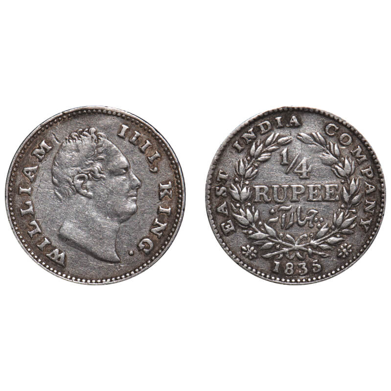 | William IV, Silver, 1/4 Rupee, 1835, Calcutta Mint, A/II, 'F' incused, Large & thick size letters of the legend, Wreath with 19 Berries (10L + 9R). F. Prid 89. GK 57. Very Fine+. Very Scarce. |