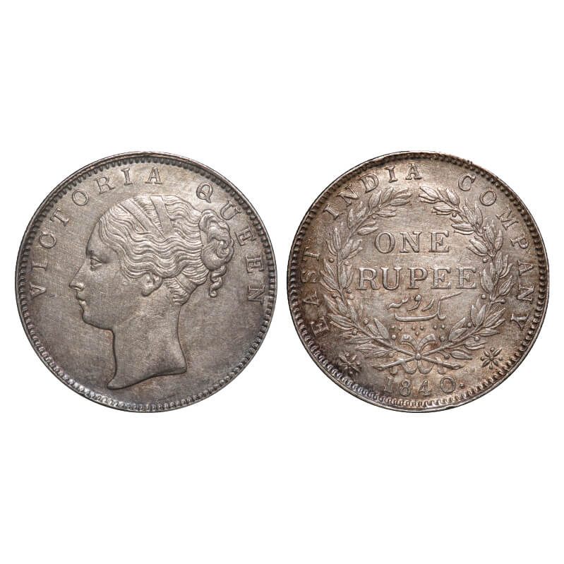Victoria Queen, Silver, Rupee, 1840, CL, Calcutta Mint, A/I, English Head, Top tips of the wreath f...