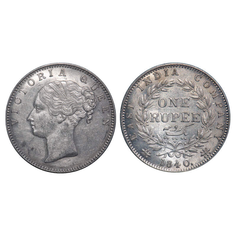 | Victoria Queen, Silver, Rupee, 1840, CL, Calcutta Mint, A/II, English Head, With bud leaves above 'O' & 'E' of One, Wreath with 19 Berries (10L + 9R). F. Prid 42. GK 82. About Uncirculated. Very Scarce. |