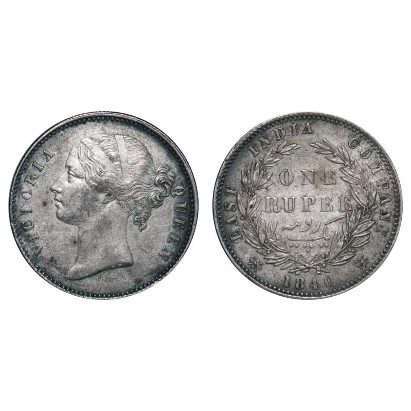 | Victoria Queen, Silver, Rupee, 1840, DL, Calcutta Mint, WIWI, Wreath with 28 Berries (13L + 15R), 'A' in Victoria w/o centre stroke, Looks like inverted 'V'. F. Prid Unlisted. GK Unlisted. Extremely Fine, Details. Very Scarce. |