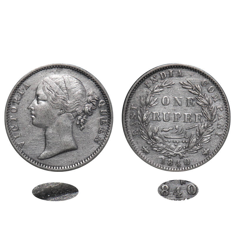 | Victoria Queen, Silver, Rupee, 1840, DL, Madras Mint, W.W. 'B' raised, Wreath with 28 Berries (13L + 15R), Broken 'B' which looks like letter P, Slanted W.W., Dancing numeral 4 in year date 1840. F. Prid Unlisted. GK Unlisted. Extremely Fine. Rare. |