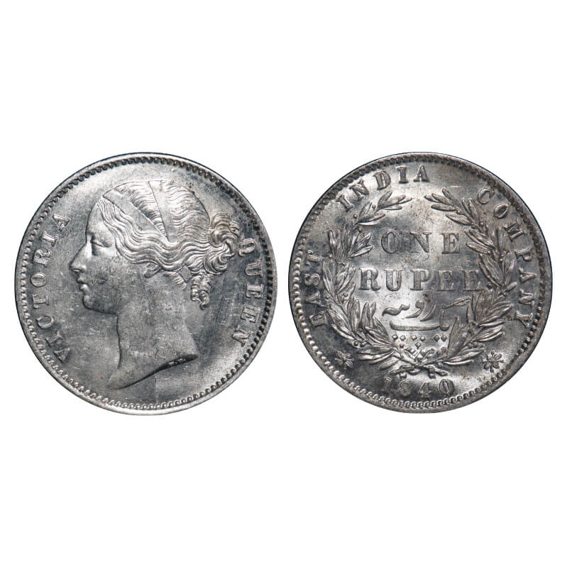 | Victoria Queen, Silver, Rupee, 1840, DL, Calcutta Mint, W.W. raised, With re engraving of hairs connecting hairlock, Die crack on Obv, Mechanical die doubling of year date 1840. F. Prid 56. GK 167. Uncirculated. Very Scarce. |