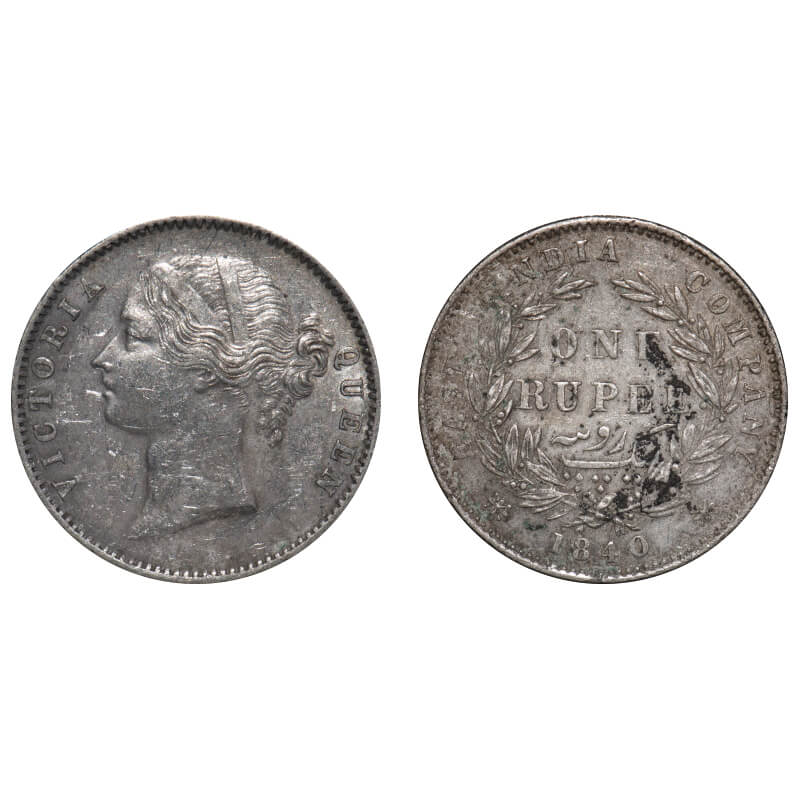 | Victoria Queen, Silver, Rupee, 1840, DL, Madras Mint, W.W. 'R' raised, Wreath with 28 Berries (13L + 15R), 'B' broken at bottom resambles like 'R', Slanted W.W.. F. Prid Unlisted. GK 174. Very Fine+, Details. Very Scarce. |