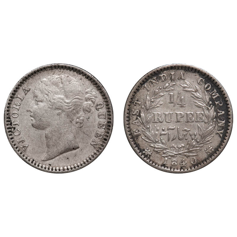 Victoria Queen, Silver, 1/4 Rupee, 1840, DL, Madras Mint, W.W. 'S' raised, Wreath with 10 Berries (6L + 4R), Cross bar of numeral 4 with serif pointing upwards. F. Prid 110. GK 205. Very Fine+. Very Scarce.
