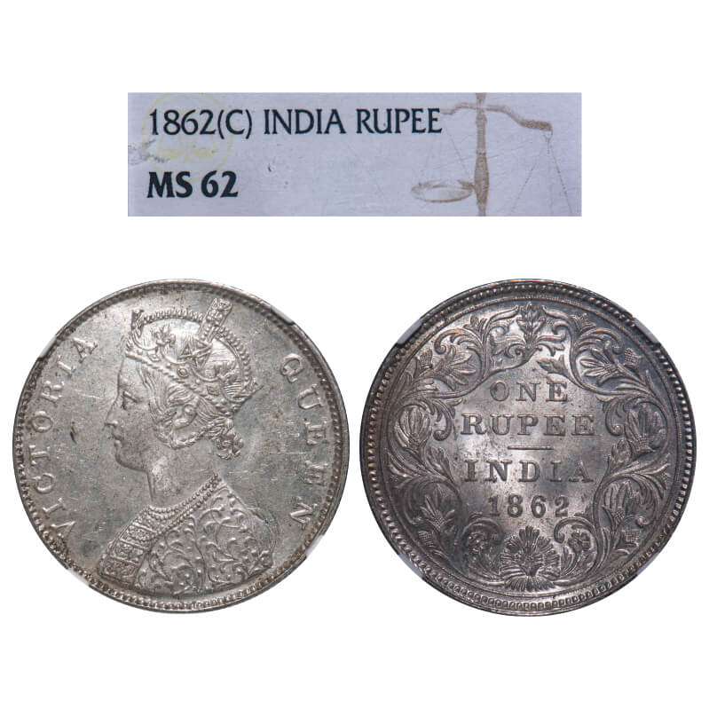 Victoria Queen, Silver, Rupee, 1862, Calcutta Mint, B/II, Embroidery in high relief, Elongated and sharp elongated Pearls on both the arches of the crown. F. Prid 55. GK 241. NGC Slabbed MS 62. Very Rare.