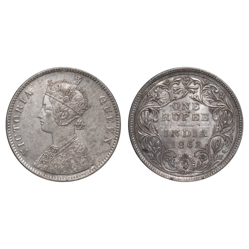 | Victoria Queen, Silver, Rupee, 1862, Calcutta Mint, A/II(iii), w/o initial 'J', Pinapple like buds at 3 different places, 2 Pineapple buds above 'O' & 'N' of One, 1 Pineapple bud above 2nd 'E' of Rupee, Nicks on Rev rim edge. F. Prid 63. GK 247. Extremely Fine+. Very Scarce. |