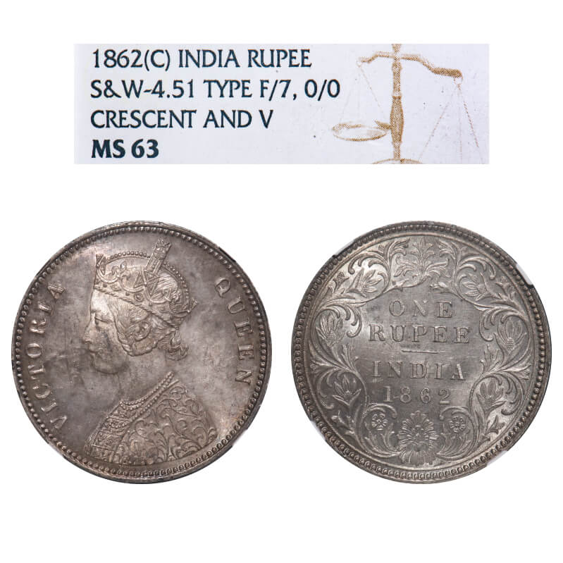 Victoria Queen, Silver, Rupee, 1862, Calcutta Mint, A/I, With initial 'J'. F. Prid 66. GK 255. NGC Slabbed MS 63. Very Rare.