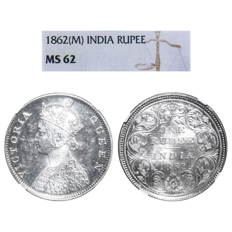 Victoria Queen, Silver, Rupee, 1862, Madras Mint, B/II. F. Prid 57. GK 266. NGC Slabbed MS 62. Very Rare.