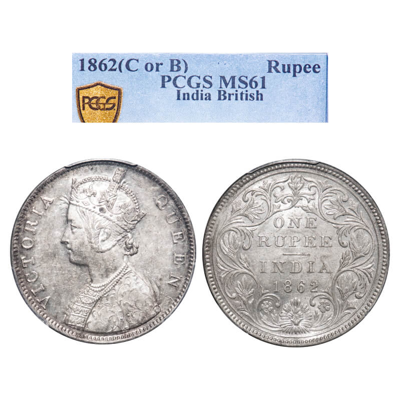 Victoria Queen, Silver, Rupee, 1862, Bombay Mint, B/II/2/0, The embroidery design has incused effect. F. Prid 71. GK 287. PCGS Slabbed MS 61. Rare.