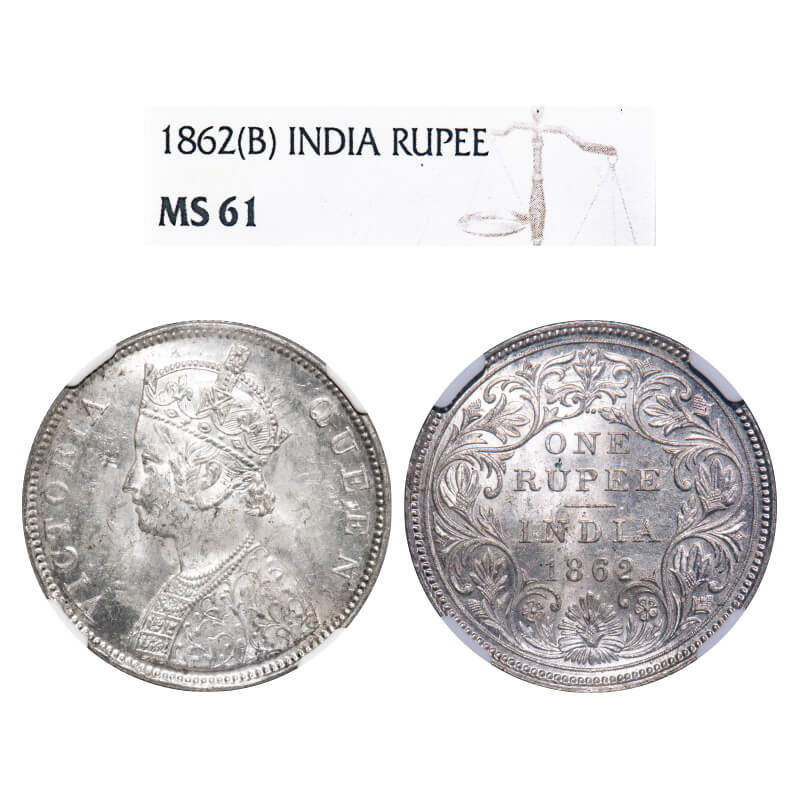 Victoria Queen, Silver, Rupee, 1862, Bombay Mint, B/II/2/0, The embroidery design has incused effect. F. Prid 71. GK 287. NGC Slabbed MS 61. Rare.