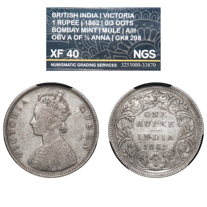 | Victoria Queen, Silver, Rupee, 1862, Bombay Mint, A/II/0/3, MULE, Obv 'A' of Half Anna, The Queen's jabot has 4 1/2 panels, The embroidery design has incused effect at the side of the scrolls. F. Prid Unlisted. GK 298. NGS Slabbed XF 40. Extremely Rare. |