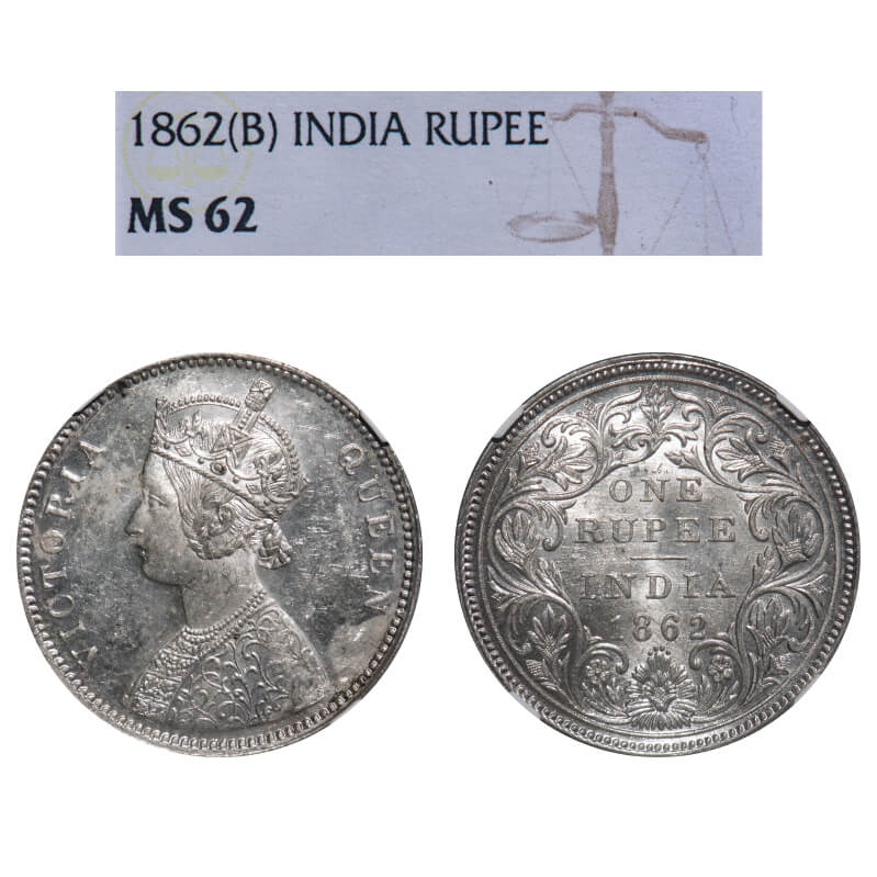 Victoria Queen, Silver, Rupee, 1862, Bombay Mint, A/II/0/4, w/o initial 'J'. F. Prid 79. GK 308. NGC Slabbed MS 62. Very Rare.