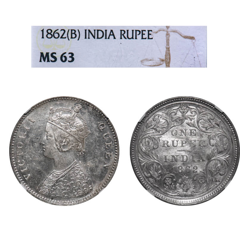 Victoria Queen, Silver, Rupee, 1862, Bombay Mint, A/II/0/4, w/o initial 'J' F. Prid 79. GK 308. NGC Slabbed MS 63. Extremely Rare.
