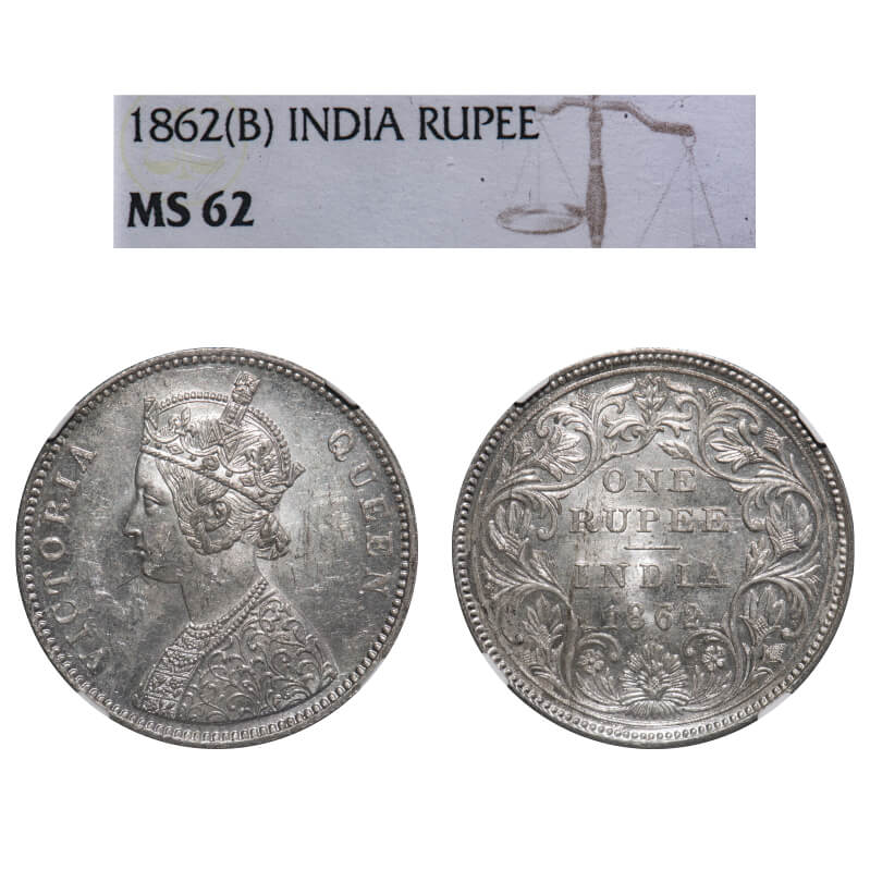 Victoria Queen, Silver, Rupee, 1862, Bombay Mint, A/II/0/5, Complete 'D' in India. F. Prid 85. GK 316. NGC Slabbed MS 62. Very Rare.