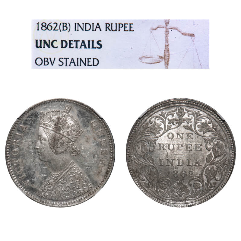 | Victoria Queen, Silver, Rupee, 1862, Bombay Mint, A/II/0/6, Complete 'D' in India, w/o initial 'J'. F. Prid 86. GK 322. NGC Slabbed UNC Details, Obv Stained. Very Scarce. |