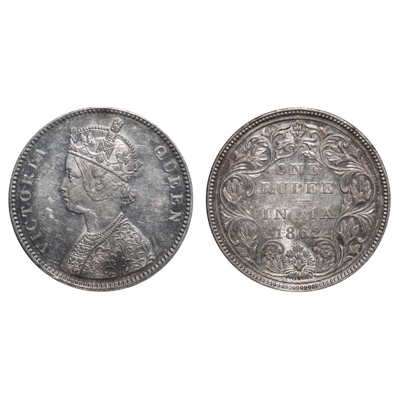 Victoria Queen, Silver, Rupee, 1862, Bombay Mint, A/II/0/6, Complete 'D' in India, w/o initial 'J'. F. Prid 86. GK 322. Almost Uncirculated with mint luster. Very Scarce.