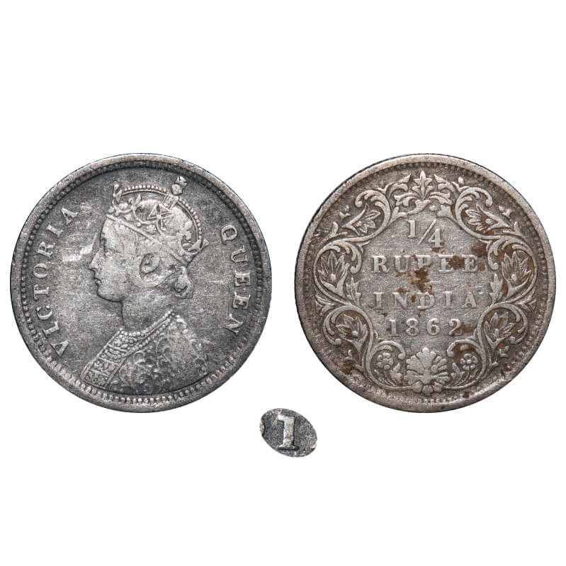 Victoria Queen, Silver, 1/4 Rupee, 1862, Madras Mint, A/I, Error, 1st letter 'I' in Victoria looks like numeral 1 inverted (short horizontal serif type). F. Prid. Unilsted. GK Unlisted. Very Fine. Very Rare.