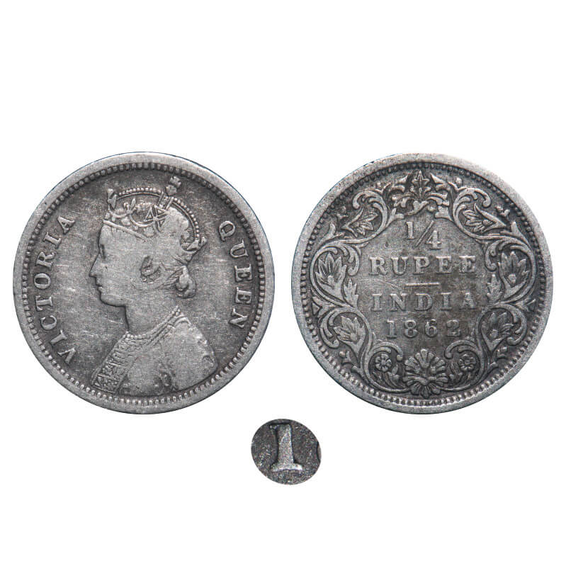 Victoria Queen, Silver, 1/4 Rupee, 1862, Madras Mint, A/I, Error, 1st letter 'I' in Victoria looks like numeral 1 (short horizontal serif type). F. Prid 378 A. GK 378. Very Fine. Rare.