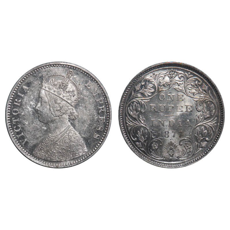 Victoria Empress, Silver, Rupee, 1877, Bombay Mint, A2/II, Dot. F. Prid 149. GK 435. Uncirculated with luster. Very Scarce.