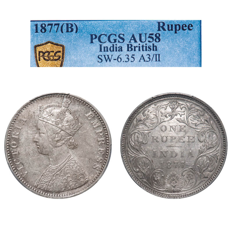 Victoria Empress, Silver, Rupee, 1877, Bombay Mint, A6/II, Dot. F. Prid Unlisted. GK 442. PCGS Slabbed AU 58. Rare.