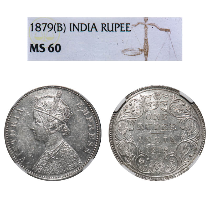 Victoria Empress, Silver, Rupee, 1879, Bombay Mint, A3/II(i), Dot. F. Prid Unlisted. GK 456. NGC Slabbed MS 60. Very Rare.