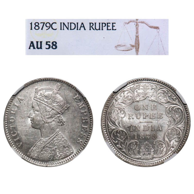 Victoria Empress, Silver, Rupee, 1879, Calcutta Mint, A1/I, 'C' incused, Struck through Error on Rev not mentioned on the slab. F. Prid 117. GK 464. NGC Slabbed AU 58. Rare.