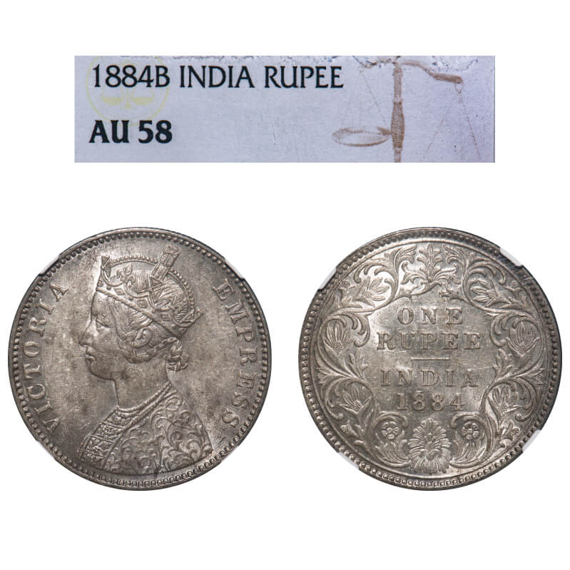 Victoria Empress, Silver, Rupee, 1884, Bombay Mint, A3/I, 'B' raised. F. Prid 167. GK 489. NGC Slabbed AU 58. Rare.