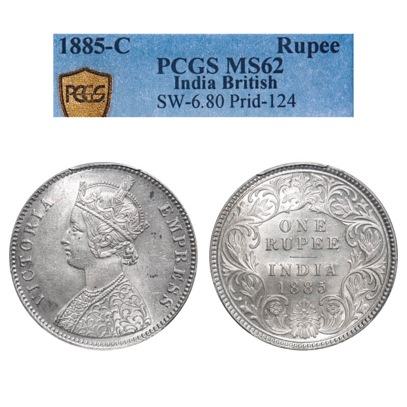 Victoria Empress, Silver, Rupee, 1885, Calcutta Mint, A1/I, 'C' incused, Top stroke of numeral 5 short. F. Prid 124. GK 518. PCGS Slabbed MS 62. Extremely Rare.