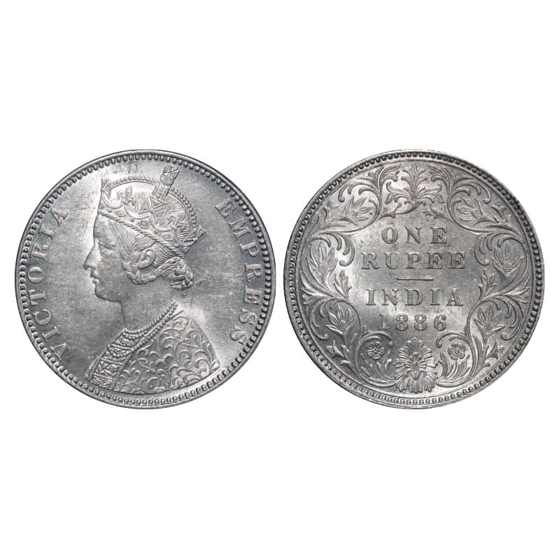 Victoria Empress, Silver, Rupee, 1886, Bombay Mint, C2/I, 'B' incused, Right bottom stroke of numeral 1 is broken. F. Prid 171. GK 523. Uncirculated. Rare.