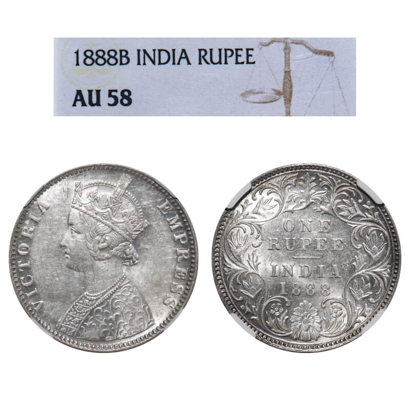 Victoria Empress, Silver, Rupee, 1888, Bombay Mint, C2/I, 'B' incused. F. Prid 175. GK 555. NGC Slabbed AU 58. Rare.