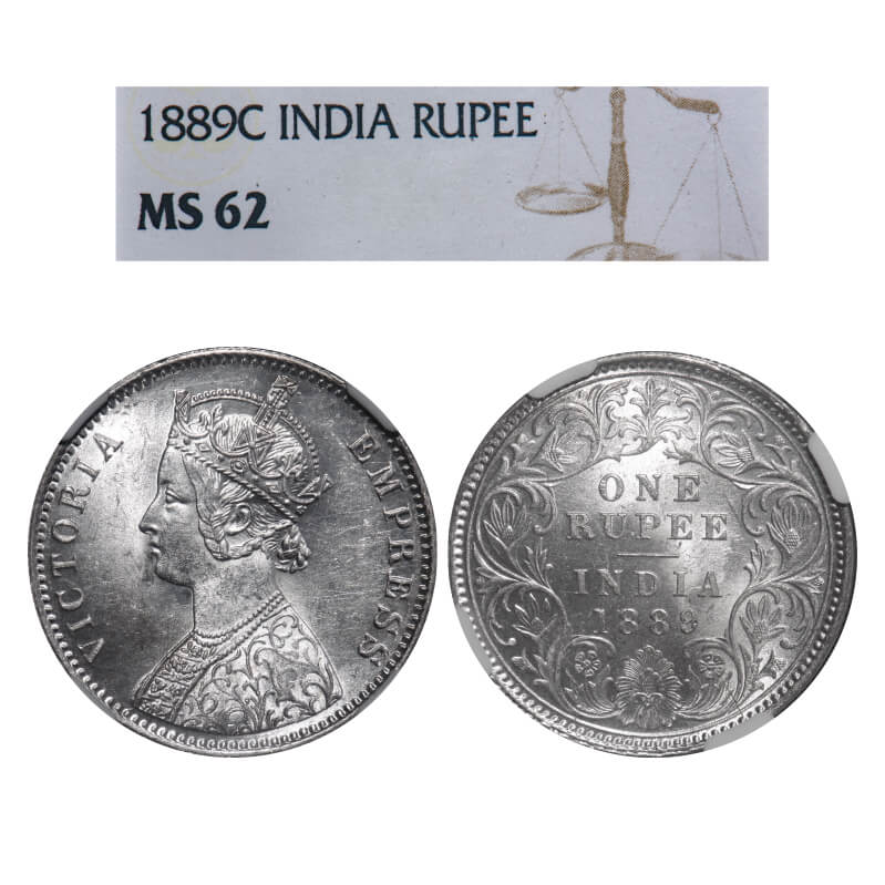 Victoria Empress, Silver, Rupee, 1889, Calcutta Mint, C3/I(i), 'C' incused. F. Prid 130. GK 565. NGC Slabbed MS 62. Very Rare.