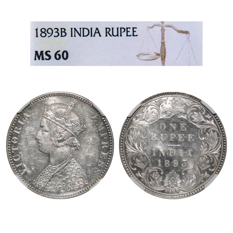 Victoria Empress, Silver, Rupee, 1893, Bombay Mint, C2/I(ii), 'B' incused, Large numeral 3. F. Prid 182. GK 579. NGC Slabbed MS 60. Rare.
