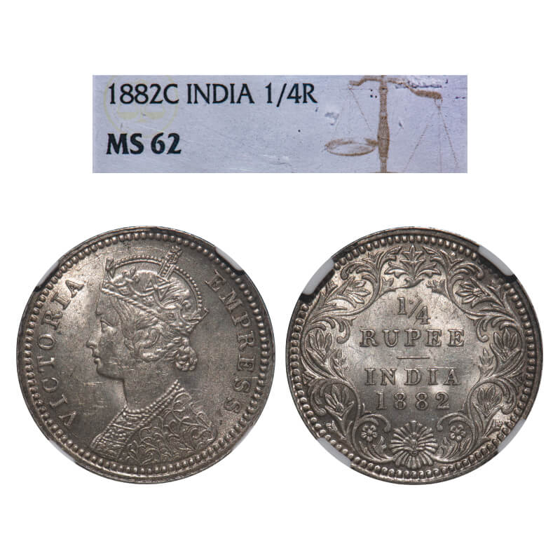 Victoria Empress, Silver, 1/4 Rupee, 1882, Calcutta Mint, C/II, 'C' incused. F. Prid 387. GK 687. NGC Slabbed MS 62. Extremely Rare.