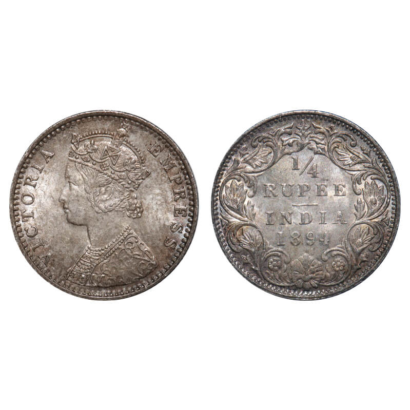 Victoria Empress, Silver, 1/4 Rupee, 1894, Bombay Mint, C(i)/I, 'B' incused. F. Prid 428. GK 726. Uncirculated. Rare.