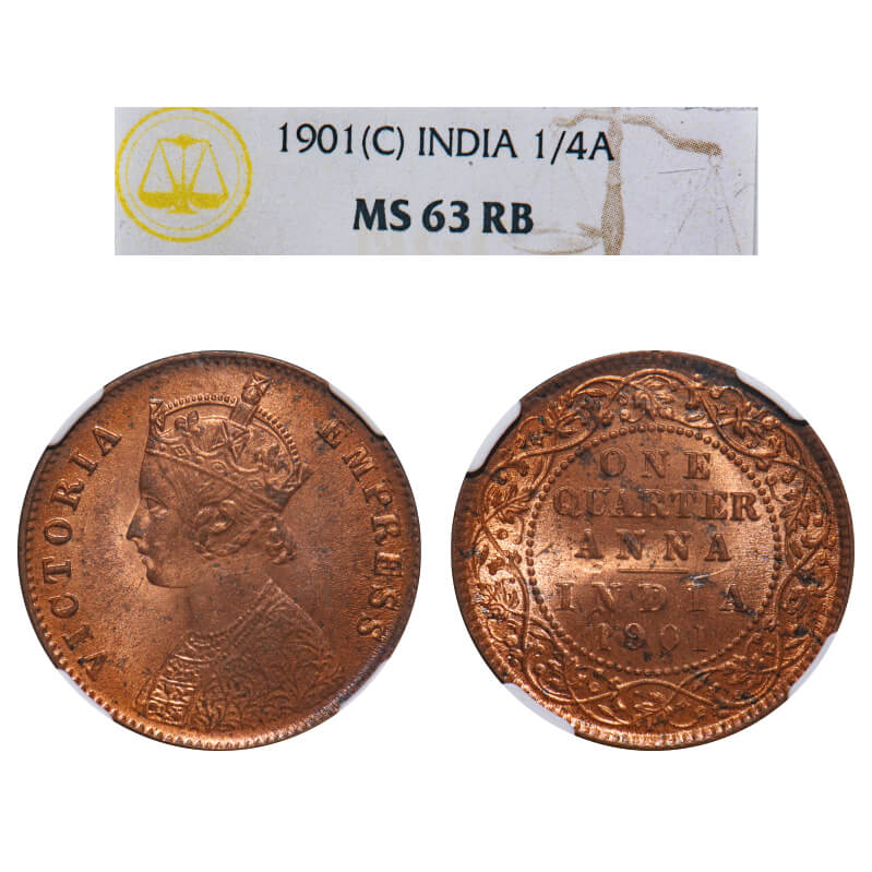 Victoria Empress, Copper, Quarter Anna, 1901, Calcutta Mint, B/II, No mint mark. F. Prid 634. GK 860. NGC Slabbed MS 63 RB. Very Rare.