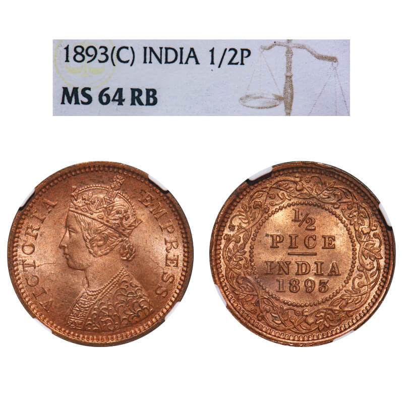 Victoria Empress, Copper, 1/2 Pice, 1893, Calcutta Mint, A/I, No mint mark. F. Prid 726. GK 873. NGC Slabbed MS 64 RB. Extremely Rare.