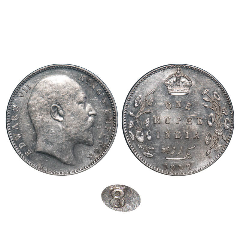 Edward VII, Silver, Rupee, 1908, Bombay Mint, 'B' incused & dot, Numeral 8 struck on numeral 7. F. Prid 204. GK 947. Uncirculated. Rare.